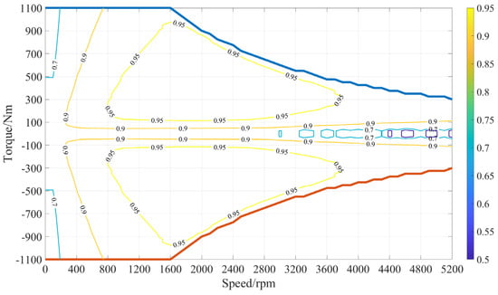 Additionally, the motor model was established using an experimental modeling approach. The operational efficiency of the motor is represented as an interpolation equation involving both speed and torque as Equation (3):