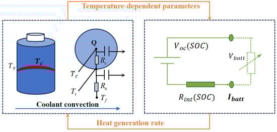 Figure 3 presents a schematic of a battery’s thermal management system, introducing the electrothermal model and the electric model, as well as the relationship between them.