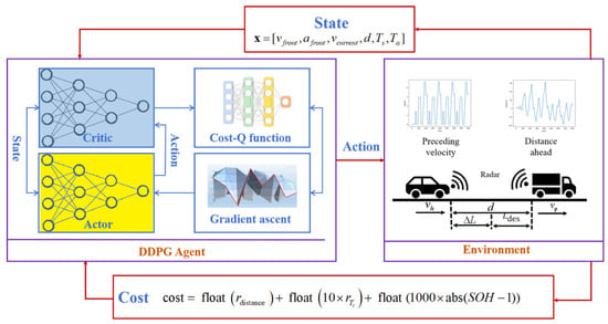 As mentioned above, the limitations of the existing studies can be summarized as follows. Firstly, although many studies have considered one of the three factors of following distance [,], energy loss [], and whether the prediction space is continuous or not [], few studies have considered all three, failing to fully meet the complex driving environment and diversified optimization needs. Furthermore, previous research has predominantly focused on methods using RL with discrete action planning, while RL algorithms in continuous action spaces have rarely been applied to the cruise control of intelligently connected EVs. Regarding this, this paper proposes a DDPG-based framework with multiple optimization objectives considered in this research [,,]. Specifically, a joint, electrochemical and aging battery model was established in the established DDPG framework to estimate a battery’s internal state in real-time and thereby guide the training process of the networks in DDPG. By integrating the developed DRL architecture with an electrothermal model for perceiving unmeasurable states, the proposed strategy enables online, model-free cruise control scheduling using the DRL model, efficiently managing the output power of EVs to maintain stable car-following distances, while jointly evaluating and constraining battery degradation impacts and ensuring the thermal safety of onboard LIBs []. In summary, this study contributes to related knowledge fields in the following aspects: