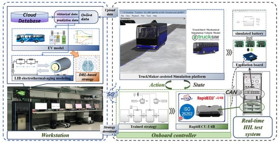 In this study, the hardware-in-the-loop (HIL) platform shown in Figure 5 was used for scheduling testing to verify the comprehensive performance of the proposed strategy. To this end, IPG TruckMaker software was used to build and analyze the performance of the automatic electric vehicle following scenarios. TruckMaker is a simulation software for testing and developing commercial vehicles, which models vehicle dynamics, supports ADAS development, and allows real-time testing with hardware-in-the-loop (HIL) setups. By simulating various driving scenarios, TruckMaker helps evaluate performance and safety, reducing the need for physical prototypes. This leads to optimized vehicle parameters, improved performance, and faster time-to-market, making it essential for modern commercial vehicle engineering. This software is a high-fidelity simulation environment with a SIMULINK interface. In addition, a workstation (Intel Xeon Sliver, 32 GB RAM, Tesla T4) was used as the cloud server to update and store vehicle and battery models and train intelligent control strategies. At the same time, the HIL platform using an embedded controller (RapidECU-U4B, 32-bit, 64KbEEPROM) achieved battery charging and discharging control at the physical layer. Wireless networks were used for communication between clouds and controllers. In this prototype, an auxiliary upper computer was used to bridge the signal channel between two devices, which could communicate with the server through a wireless network and automatically configure the controller based on its communication content. It is worth noting that in practical applications, an auxiliary upper computer in a prototype system can be replaced by a pair of commercial 5G transceiver modules, thereby achieving point-to-point communication with longer distances and lower latency. In addition, the trained strategy was downloaded to the vehicle controller on the HIL platform for real-time scheduling. The interaction process between the vehicle controller and the environmental simulator was coordinated by a real-time PC. In the experimental environment setup, the computational efficiency of the trained DDPG algorithm could be well guaranteed; thus, this paper presents the algorithm’s convergence performance during training, while placing a greater emphasis on demonstrating the impact of the algorithm’s real-time decision-making process on the overall control effectiveness.