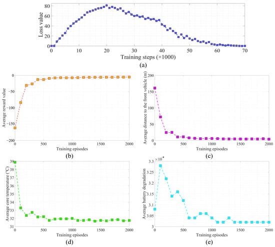 Indicators of the training process. (a) Residual of action selecting the network. (b) Reward value. (c) Distance to the front vehicle. (d) Internal temperature of the battery. (e) Battery degradation.