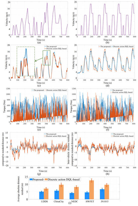 Driving cycle used for the velocity simulation of a front vehicle: (a) China City Driving Cycle; (b) New European Driving Cycle (NEDC). (c,d) Comparison of the velocity profile. (e,f) Comparison of the torque profile. (g,h) Comparison of the inter-vehicle distance residual compared to the standard distance. (i) Average distance residual under different driving cycles.