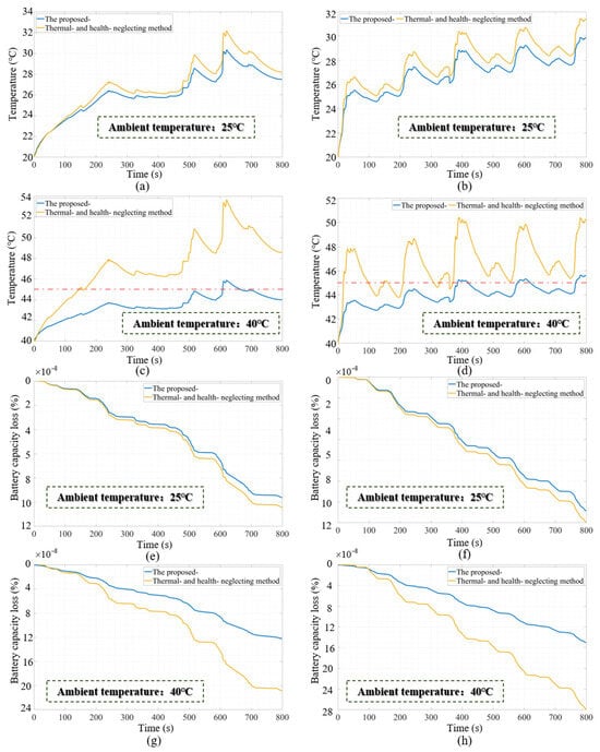 Additionally, in Figure 8c,d, at an ambient temperature of 40 °C, the proposed method outperformed the thermal- and health-neglecting method in terms of internal battery temperature control under both driving conditions, achieving a reduction of 4 °C to 8 °C for the majority of the time. The method consistently maintained the battery temperature around 45 °C, effectively mitigating potential risks associated with battery overheating and reducing the wasteful conversion of electric energy into heat.