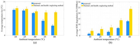 For a holistic evaluation, tests were conducted across various ambient temperatures, specifically 10 °C, 25 °C, 30 °C, 35 °C, and 40 °C. The results clearly delineated the disparity between the proposed method and the thermal- and health-neglecting method across these critical metrics. As depicted in Figure 9a, with the rise in ambient temperature, both methods exhibited a trend of increasing the average battery temperature. However, across all temperatures, the temperature rise observed in the proposed method was consistently lower than in the thermal- and health-neglecting method. At an ambient temperature of 10 °C, the temperature increase in the proposed method was 6.25% less than that of the thermal- and health-neglecting method, and at 40 °C, it was 57.14% less. This difference became even more salient with the ascent in ambient temperature, underscoring the method’s proficiency in maintaining battery temperature stability.