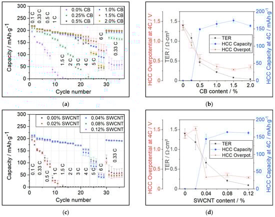 (a) C-rate test of PC-NCM811 cathodes with different CB contents in HCC; (b) Comparison of TER vs. overpotential (Overpot.) and discharge capacity measured at 4C in HCC for PC-NCM811 cathodes with different CB contents; (c,d) same tests for PC-NCM811 cathodes with SWCNT as replacement for CB under variation of SWCNT contents.