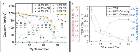 (a) C-rate test of SC-NCM811 cathodes with different CB contents in HCC; (b) Comparison of TER vs. overpotential and discharge capacity measured at 4C in HCC for SC-NCM811 cathodes with different CB contents.