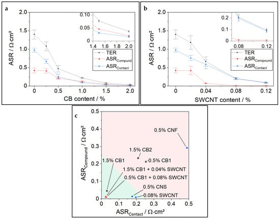 After correlating HCC results with ERM and defining the TER threshold value, we want to focus in more detail on the similarities and differences of different CA types. As shown in [], the electronic resistance of an electrode consists of the resistance in the coating compound (RCompound) and the resistance at the interface between the coating and CC, often designated as contact resistance (RContact). For better comparability of resistance contributions, we harmonized the resistance dimensions by normalizing the RCompound to the electrode area (ASR). Figure 3a,b show RContact and RCompound from the ERM of PC-NCM811 cathodes with different amounts of CB and SWCNT.