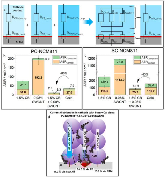 As discussed earlier, it is rational to split TER into RCompound and RContact. Now we add the assumption that within the compound as well as the contact plane to CC, the resistance contributions of CAM, CB, and SWCNT can be separated into parallel resistances. The influence of PVDF was neglected in this model. Still, to obtain a fair comparison, the PVDF content was held constant at 1.38% in the investigated samples. From measurements performed for cathodes without CA (CAM sample) and at different CA contents (CAM + CB and CAM + SWCNT samples), it was possible to calculate the contribution of each component by using this simple resistance model. The detailed formulas are shown in Supplementary Materials, Section S3. The resistance model also allows each component to attribute its individual share of the total current transported in the compound and through the contact plane. A scheme of this current distribution is given in Figure 4d for a PC-NCM811 cathode with a binary mix of CA (1.5% CB + 0.08% SWCNT), which enables a better understanding of the impact and function of each component. The CA-mix cathodes were also manufactured and measured in ERM and HCC. The ERM results of cathodes containing single-type CA vs. one exemplary CA-mixture are shown in Figure 4, together with the estimated TER for PC-NCM811 (b) and SC-NCM811 (c). The calculation tables are given in Supplementary Materials, Section S3. As expected, the binary mixture of CAs profits from the benefits of each of its components. ASRCompound as well as ASRContact are lower in the mixture than in each of the single CA cathodes. In fact, we can even observe 66% and 43% lower electronic resistances in the experiment for PC-NCM811 and SC-NCM811, respectively, than expected from the theoretical model. The exact reason for the lower-than-expected electronic resistance is not well understood and needs further research. The authors assume a synergic effect between the two Cas; therefore, this deviation will be further designated as a “synergy effect”.