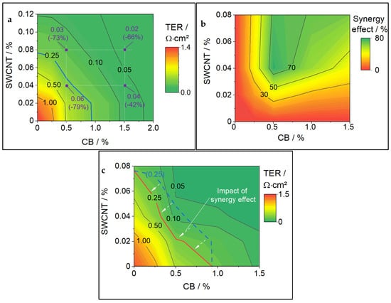 The calculated values for TER (shown as contour in Figure 5a) have then been reduced by the experimentally found synergy effect (shown as contour in Figure 5b) to enable the closest possible TER forecast for the full matrix of possible CA-mixtures. The results of these correction calculations are given in the contour plot in Figure 5c. The synergy effect values were only interpolated (towards 0% CA) and not extrapolated; therefore, Figure 5b,c are only given for the experimentally tested matrix up to 0.08% SWCNT + 1.5% CB.