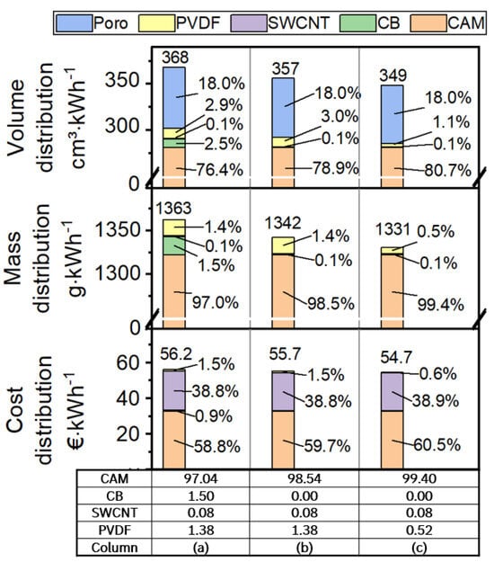 The second row shows the mass of electrode compound needed for 1 kWh of battery cell. The weight distribution is already known as the formulation is by default given in %, and it clearly shows that a reduction in both CB and PVDF saves about 2.35% of the compound weight per 1 kWh of cell from 1363 g∙kWh−1 (column (a)) to 1331 g∙kWh−1 (column (c)).