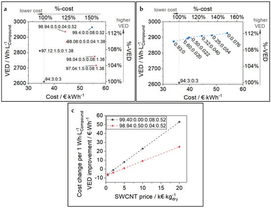 It is possible and of industrial interest to quantify the costs that arise with the VED improvement through the use of SWCNTs. For example, as shown in Figure 7a, the change in formulation from 94:3:0:3 to 99.4:0:0.08:0.5 can increase VED by 354 Wh∙L−1Compound (+13.5%). However, at the same time, the cost parameter is increasing considerably by 18.7 €∙kWh (+52%). In other words, 1 Wh∙L−1Compound of VED improvement comes at a high cost of 53 €∙Wh−1. Of course, this cost change per VED improvement strongly depends on the price of SWCNT used in the cathode formulation. Therefore, a sensitive analysis of the impact of SWCNT price on cost per VED improvement over a baseline composition (94:3:0:3) is shown in Figure 7c for two exemplary formulations. More details on the calculation are given in Supplementary Materials, Section S7. The VED improvement over the baseline is 354 Wh∙L−1Compound (+13.5%) and 325 Wh∙L−1Compound (+12.4%) for 99.40:0.00:0.08:0.52 and 98.94:0.50:0.04:0.52, respectively. With the decreasing price of SWCNT, the cost per 1 Wh∙L−1Compound of VED improvement declines linearly, and, as expected, the slope is lower for the sample containing less SWCNT. Interestingly, as soon as the SWCNT price falls below about 2 k€∙kg−1, the cost change per VED improvement becomes negative. This means that while VED is increasing, the cost for 1 kWh of cathode compound is falling below the baseline formulation (94:3:0:3). This is caused by the reduction in inactive materials CB and PVDF in the formulations, exploiting the synergy effect observed for SWCNT, which leads not only to improved VED but also reduced cost.