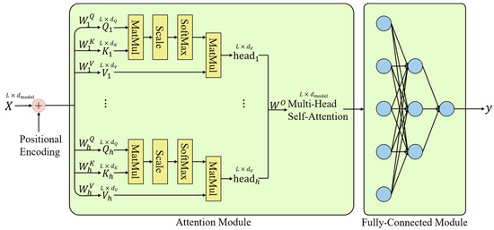 Denote X = [ x 1 T ,   x 2 T ,   ,   x L T ] T as the input sequence, and x i T = [ x i 1 ,   x i 2 ,   ,   x i m ] , where L is the sequence length, and m = d m o d e l is the dimension of the input sequence. The calculation of attention mainly involves three aspects, i.e., query Q , key K , and value V , derived by Q = X W Q ,   K = X W K ,   V = X W V , where W Q , W K , W V are the weight matrices with the dimension of d m o d e l × d Q , d m o d e l × d K , and d m o d e l × d V , respectively. As the requirement of the calculation, d Q = d K should hold, and d K = d V is a common setup in practical applications similar to our work.
