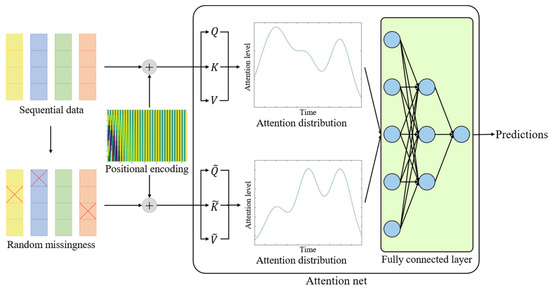 In the case of missing data within self-attention, the absence of values at specific positions—manifested as random zeros within the input X —directly affects their influence on the similarity calculations between queries and keys. Denote the data input with missing values as X ; then, the query, key, and value can be articulated as Q = X + P E W Q ,   K = X + P E W K , and V = ( X + P E ) W V , respectively. While missing values do not disrupt the attention values’ computation, the resultant attention scores inherently reflect the data’s absence and maintain positional context, as depicted in Figure 2. Consequently, the mechanism intuitively assigns greater attention weights to the present data, ensuring that the calculated scores naturally diminish the impact of any missing elements, thereby implicitly moderating the undue emphasis on missing values. This intrinsic modulation of attention allows the model to concentrate on the segments of data that are available, resonating with the fundamental principle of the self-attention mechanism to prioritize segments enriched with information.