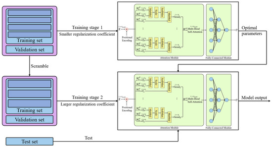 Overfitting poses a significant challenge in network training. To avoid the overfitting issue, our approach incorporates a two-stage training methodology, as illustrated in Figure 3. This strategy involves distinct settings for the regularization coefficient and batch size in each stage. Initially, the training commences with a smaller regularization coefficient and a reduced batch size for a duration of 50 epochs. The network parameters are then preserved at the point where the training error reaches its minimum during this initial phase. Before the second stage, the division of the dataset into training and validation sets is re-randomized. The subsequent stage of training proceeds from the previously saved network parameters, now employing an increased regularization coefficient and a larger batch size. This two-stage technique for training enables the network to learn with enhanced precision while effectively preventing overfitting.