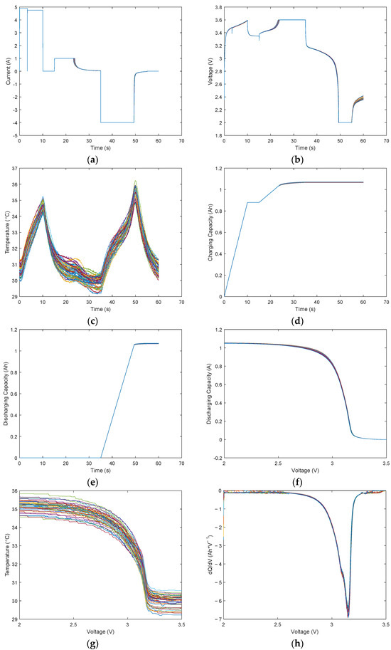 Figure 4. The contents of input data. (a) Current. (b) Voltage. (c) Temperature. (d) Charging capacity. (e) Discharging Capacity. (f) Discharging capacity variation against voltage. (g) Temperature variation against voltage. (h) Incremental capacity. The different line colors indicate different cycles of the displayed battery cell.