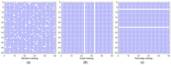 Figure 6. Examples of the various types of data missing [43]: (a) random missing, (b) cycle missing, and (c) time-step missing.
