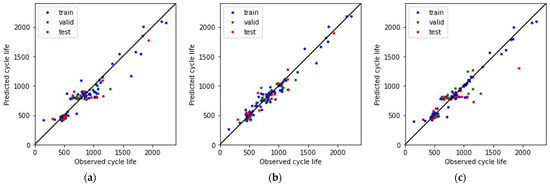 The prediction results of the proposed method, in scenarios without data missing, are displayed in Figure 7, wherein the conducted battery lifetime prediction using the initial 20, 50, and 100 cycles, respectively, is shown. As can be seen from the results in Figure 7, the cycle life predictions in all three conditions are relatively accurate (i.e., close to the ideal prediction line, represented by the black solid line in the figures), with the test APE of 13.02%, 10.59%, and 15.16%, respectively. In addition, compared to the results presented in [29], it is evident that our approach effectively addresses the challenge of outliers, showcasing enhanced predictive accuracy and reliability.