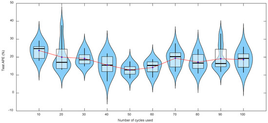 Figure 8. The violin plot for the influence of using different number of cycles. Under each number, 10 different splits of train/valid/test datasets were conducted. In the figure, the bold lines represent median APE values, the boxes represent quartiles of the APE values, and blue dots represent mean APE values with the red line connecting them, and the blue areas represent the probability distribution of the APE values.