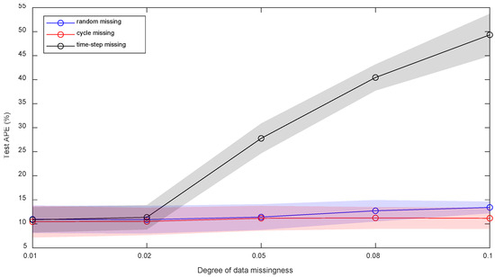Figure 9. The impact of data-missing degree on battery lifetime prediction in different data-missing scenarios. The shaded areas represent the values within one standard deviation across the results of five different train/valid/test splits.