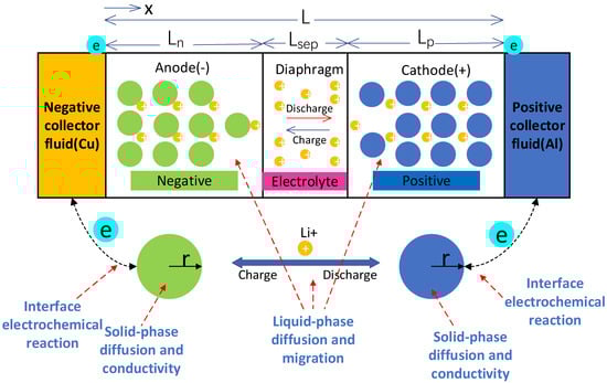 Based on the theory of porous electrodes, an electrochemical model of lithium-ion batteries is established using a pseudo-two-dimensional (P2D) model. Then, a particle-scale diffusion-induced stress model is then coupled based on the distribution of lithium-ion concentration in the positive and negative active particles to analyze and study the stress and strain inside the active particles. The schematic diagram of the P2D model is shown in Figure 2. It can be seen from the figure that the reaction domain of the P2D model is mainly divided into two phases and three regions, which are the solid-phase region (electrode solid particles) and the liquid-phase region (electrode and diaphragm pores). The three-region reaction mainly includes solid-phase diffusion and conduction, liquid-phase diffusion and conductive migration, and interfacial electrochemical reaction.