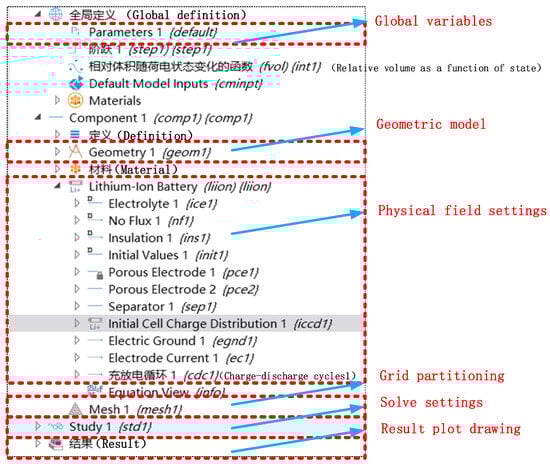The three-dimensional model in this article is calculated using a unidirectional coupling method in COMSOL simulation software. First, the relevant parameters and operating conditions of the electrochemical model are configured, and after grid partitioning, the transient solution is performed after initialization calculation to obtain the changes in internal parameters during the charging and discharging process. Then, the results of the electrochemical model calculation are input into the dependent variable solved by the solid mechanics module. By setting the relationship between the negative-electrode lithium-concentration distribution field and the negative-electrode volume expansion, and adding boundary conditions and initial values, the stress and strain distribution field during the charging and discharging process of the battery are obtained through steady-state calculations.
