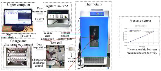 This paper adopts a commercial ternary polymer lithium-ion soft-pack cell, with a nominal voltage of 3.7 V, a charging cut-off voltage of 4.2 V, and a discharge cut-off voltage of 2.75 V. The battery voltage and battery surface pressure are verified by the acquisition model of the battery test platform shown in Figure 4. The selected film pressure sensor is a piezoresistance sensor, and the battery surface pressure is obtained through the fitting relationship between the resistance and the pressure. The resistance data of the pressure sensor were collected by key34970A produced by Agilent Company in Santa Clara, CA, USA.