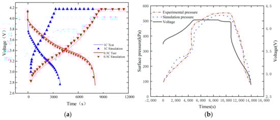 The model is verified by charging and discharging at normal temperature. As shown in Figure 5a, the simulation data of charging and discharging voltage is well consistent with the test data, and the maximum error between the simulation and the actual test voltage is 3.1%, indicating that the parameters of the model at normal temperature are accurate and meet the requirements for application. We choose the surface pressure of the battery as the index for model validation because there is still a lack of experimental methods to directly obtain the full-field stress distribution during the operation of commercial lithium-ion batteries. Considering the existing conditions in the laboratory, we adopt measures to apply constraints to the battery and monitor the surface pressure, which indirectly reflects the average stress in the battery. The experiment shown in Figure 5b was carried out at 1C rate discharge at an initial pressure of 100 kPa. The average error of the measured pressure and simulation results is 19.8% during the whole charging and discharging process, which proves that the coupling model can improve the mechanical characteristics of the simulation battery.