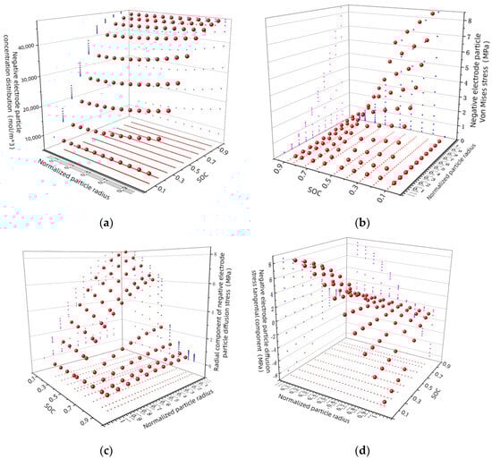 As shown in Figure 6d, during the charging process, the tangential stress inside the particle presents two forms of tensile stress and compressive stress. In the central part of the particle, the form of tensile stress is mainly manifested, while in some areas near the surface of the particle, the form of compressive stress is manifested. At a distance of from the center of the particle, the tangential stress is zero. In the charging stage, the tangential stress on the surface of the anode’s active particles is the largest at the beginning of charging, which is the compressive stress. In the discharge stage, the tangential stress on the surface of the negative active material particles at the end of discharge is the largest, which is the tensile stress. As a result, the surface of the anode’s active particles is more likely to crack at the end of discharge or at the beginning of charging. It can also be seen from the figure that the two components of the electrode particle diffusion stress are equal at the center of the particle, so the equivalent stress at the center of the particle is zero according to the calculation of Equation (21).
