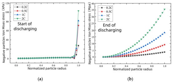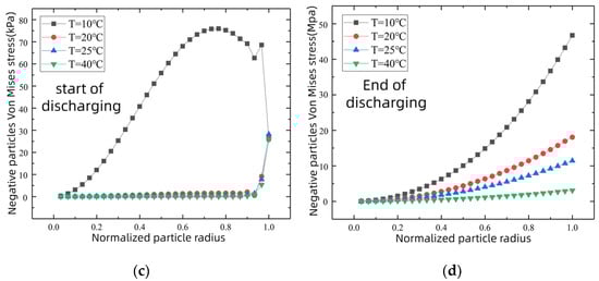 As can be seen from Figure 7a,b, when the discharging rate increases from 0.2C to 1C, the Von Mises stress of the negative-electrode particle near the surface increases sharply, with its size being about six times the original, the most drastic change of all. When the discharging ratio is changed to 2C, the diffusion stress of the electrode particles increases sharply, with the largest stress appearing at the particle surface, with more than 30 MPa. As can be seen from Figure 7c,d, the electrode particle diffusion stress is larger in the environment below 10 °C than at any other temperatures from the beginning of discharge and exceeds 40 MPa at the end of the discharging. However, the diffusion stress of the electrode particles did not change significantly at the ambient temperatures of 20 °C, 25 °C, and 40 °C. For graphite anode materials, the tensile yield strength limit of the common graphite anode materials available in the market is approximately 30 MPa [28]. The 2C discharging rate and 10 °C environment temperature of the Von Mises stress is greater than the graphite anode material’s tensile yield strength limit, which is very likely to cause rupture on the active material surface, or even cause graphite negative-electrode failure, and a decline in battery discharging capacity.