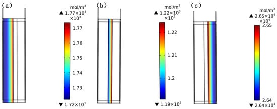 Lithium-concentration distribution inside the battery at the end of the discharging: (a) the negative region; (b) the diaphragm region; (c) the positive region.
