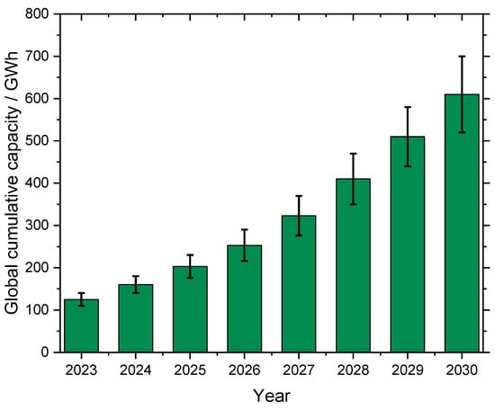 Throughout Europe, 75% of greenhouse gas (GHG) emissions are generated by the energy sector. Therefore, the EU’s objective is to promote the expansion of renewable energies to reduce GHG emissions by at least 55% by 2030 compared to 1990 levels. This includes a mandatory target of at least 42.5% renewable energy by 2030 [1]. However, energy derived from renewable sources is highly volatile, uncertain, and location-dependent. Consequently, the integration of energy systems necessitates flexibility to ensure the security of supply. Flexibility can be understood as the ability to balance the emerging residual load. The residual load is defined as the electricity demand reduced by the energy provided by renewable sources. As the proportion of renewable energy in the electricity mix increases, conventional power generation will increasingly need to align with the residual load. The flexibility can be provided through three components. Firstly, supply side provision is facilitated by transmission and distribution networks via flexible power plants. Secondly, demand-side utilization involves the introduction of new loads as part of electrification. The third component comprises energy storage [2]. The expansion of stationary storage systems is therefore becoming one of the most crucial strategies for reducing CO2 emissions in the long term. Figure 1 illustrates the increasing demand and significance of storage systems based on the expected global and cumulative amount of installed battery capacity (in GWh) by 2030. The Figure 1 is based on the model proposed by Jarbratt et al. [3]. Consequently, a significant surge in resources for the production of storage systems is expected.