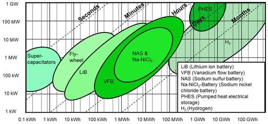 Schematic representation of different storage technologies with the typical capacities and power ranges. Based on Thielmann et al. [4].