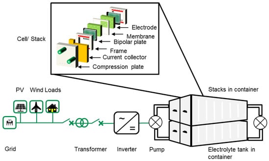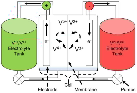 In order to analyze the factors of the circular economy, a profound understanding of VFB is a fundamental prerequisite. The battery design exhibits similarities to fuel cells [10]. As illustrated in Figure 3, the VFB comprises at least one stack and two tanks. The conversion of energy occurs within the stacks, and the energy is stored in the aqueous electrolyte in external tanks. Accordingly, the number or size of the active areas in the stacks determines the battery’s power, while the quantity of the electrolyte determines the battery’s capacity. Consequently, the power and capacity of the battery can be scaled independently, allowing the battery to be constructed according to the required specifications [11,12]. As shown in Figure 3, the electrolyte and the stack, the reaction site, are locally separated.