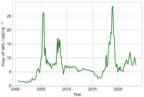 Depending on the energy-to-power (E/P) ratio of the battery, the electrolyte contributes approximately half of the system costs [11]. As shown in Figure 4, the price of vanadium pentoxide (VP) is extremely volatile, leading to little planning security for industrial applications. Moreover, the VP, depending on the exact design and other variables, is responsible for a large portion of emissions. The global warming potential (GWP) emissions of the primary electrolyte of the VFB cause approximately 70% of the GWP emissions [12,18]. However, this statement must be contextualized with the latest insights, as the electrolyte, depending on the critical contamination in the electrolyte, can be recycled. Through the treatment of the electrolyte, the GWP of the electrolyte can be reduced by up to 99.8% [19]. This also implies significant cost savings for the electrolyte and consequently for the VFB. This significantly enhances the planning security for VFB systems as well.