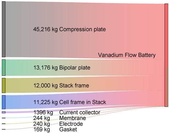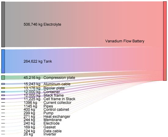 Another advantage is that significantly less of the critical compound VP is required through treatment [19]. To understand the mass ratios and resource utilization of the VFB, the ratios are depicted in Figure 5. The absolute masses provided are based on our own previous work [12], with the corresponding capacity of the VFB being 8 MWh and a power of 1 MW. The electrolyte weighs approximately 500 t, accounting for 57% of the weight of the VFB. Whereas the electrolyte consists of water to 60.2% and only 11% of VP. Furthermore, the electrolyte contains sulfuric acid (28.5%) and phosphoric acid (0.3%).