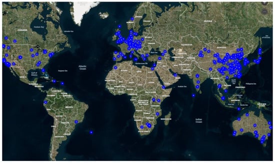 However, it must be noted that the E/P ratio of 8:1 is the standard value for VFBs, and the mass ratios do not result from a percentage-wise higher capacity compared to the power. The latest projects in China, however, have a lower E/P ratio, as this can be flexibly adjusted to the respective requirements with the VFB. The two largest VFB projects are both located in China, one in Dalian City with 100 MW/400 MWh capacity and the other in Xiangyang with 100 MW/500 MWh capacity [6]. China currently dominates and is expected to continue dominating the VFB market. For the year 2023, VFB projects in China with a capacity of 4.5 GWh were announced, more than doubling the capacity from the previous year. However, the implementation of these projects needs to be monitored [21]. Figure 7 illustrates over 300 VFB projects worldwide, depicting those that have been implemented, announced, contractually secured, or are currently under construction.