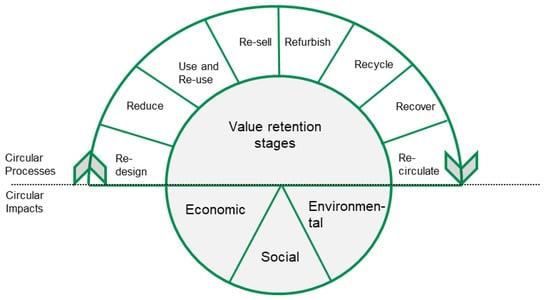 The costs for VFBs have been extensively discussed in various life cycle costing (LCC) studies [11,47,48,49,50,51,52,53,54,55], and the S-LCA has been transparently elucidated in Koese et al. [56]. The environmental impacts of VFB have also been adequately and transparently described through LCAs [12,18,57,58,59,60,61,62]. However, the circular processes have not been fully addressed in the literature. Before the circular processes can be transparently applied to circular impacts, the value retention stages must first be analyzed. Various approaches to combining these factors exist.