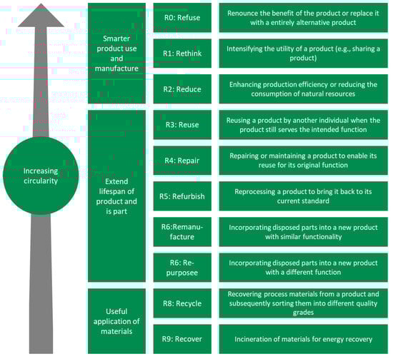 The R-strategies, or value retention strategies, derive their name from the prefix “R” meaning “back” or “again” in Latin. There are various manifestations of R-strategies in the literature, generally representing measures to efficiently use products and resources. Reike et al. [28] examined 69 peer-reviewed papers and identified the use of 38 different “re” words. These strategies operate on three levels and serve sustainable development. The first level is the microeconomic level, focusing on products, companies, and consumers. The second level is the mesoeconomic level, primarily concerning eco-industrial parks and the supply chain. In contrast, the third level, the macro level, considers cities, regions, countries, and beyond, aiming to create long-term environmental quality, economic prosperity, and social justice. These three core factors should be preserved for the current generation while being attainable for future generations [45].
