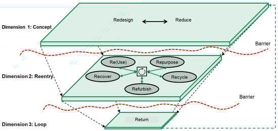 The individual dimensions are divided by barriers, as shown in Figure 10. To reach the next dimension through the barrier, one of the indicators of the barriers must be significantly improved, or the overall sum of factors must be better. The criteria of the barriers must first be defined. The choice of indicators depends on the product system and the research question. Accordingly, the conditions of the barriers can be freely defined. Nevertheless, general statements about the barrier functions can also be defined. It is generally advisable to consider the economic impact, and furthermore, any CE factors can be selected. The barriers separate the individual dimensions and ensure that the new concepts or approaches are realistic and/or feasible. Individual examples of the barriers are also mentioned in the following sections.