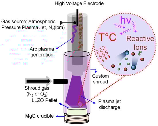 Open-air plasma treatment on LLZTO pellets to remove surface Li2CO3 was carried out using a FG5001S - V1.10 Open-air® Plasma Generator (Plasmatreat GmbH, Steinhagen, Germany). This system has been shown to be compatible with a range of materials and device structures in previous work [41]. The LLZTO pellets were placed on MgO crucibles serving as substrates during the plasma treatment. The varied plasma conditions in this study included exposure time and the shroud gas environment post-plasma exposure (N2 or O2). Figure S2 outlines the steps for preheating and exposing the LLZO pellet to an open-air plasma jet. All treatments had 100% plasma cycle time (duty cycle). The plasma output power, generator DC voltage, and high-voltage transformer current are not directly controlled and remained between 630–645 W, 270–280 V, and 11–12 A, respectively. The N2 ionization gas flow rate was also kept constant at 20 L per minute (lpm), and the distance between the plasma nozzle and the LLZTO pellet was set at 1 mm. Shroud gas (N2 or O2) flow was used for post-plasma treatment cooling with the flow rate kept at 43 lpm for 5 min.