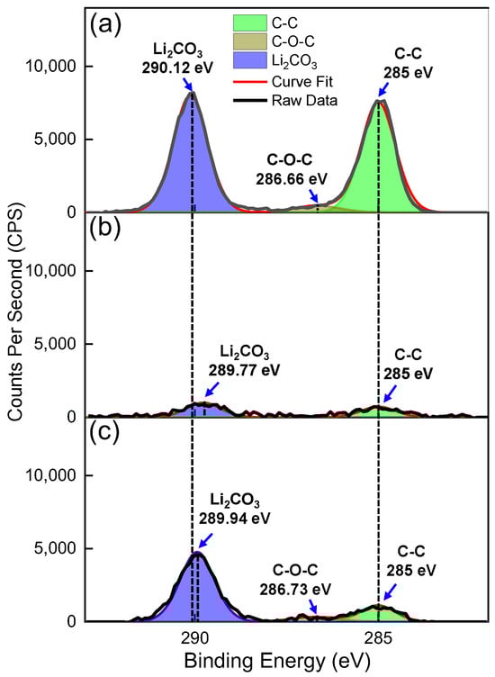 The high-resolution Li 1s, O 1s, and C 1s spectral peak components were fitted with CasaXPS software (Version 2.3.25PR1.0) [55]. Backgrounds for these components were quantified using a Shirley-type subtraction method that adjusts to changes in the spectral data, ensuring accurate background computation [56,57]. Additionally, Kratos sensitivity factors specific to the XPS instrument used in this study were applied to enhance the fitting accuracy [57].
