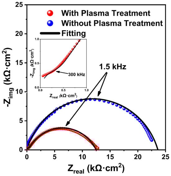 Nyquist plot of the LLZTO pellet measured in a pouch cell observed after 2 days of ambient air exposure and after open-air plasma treatment for 20 min.