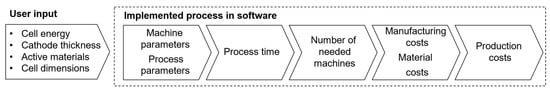 We estimated the costs of each production step by contacting manufacturers and from proprietary studies conducted at the Chair of Production Engineering of E-Mobility Components at RWTH Aachen University. The estimates are included in Table 4. For the cell-assembly processes, the rates refer to the production of cylindrical cells with a capacity of Wh, and for the stack-type cells, they refer to cells with a capacity of 170 Wh. In the cost model, the process rates are adjusted for the cell capacity according to Equation (11).