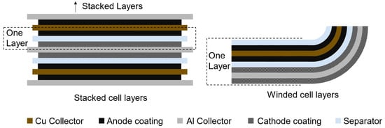 Visualization of bi-layers in stacked and winded cells. A stacked bi-cell layer is composed of half a sheet of Cu and Al current collectors, coated with anode and cathode materials, respectively, and separated by a sheet of separator. A winded bi-cell layer includes a full sheet of Cu and Al current collectors, coated on both sides, and two sheets of separator material.