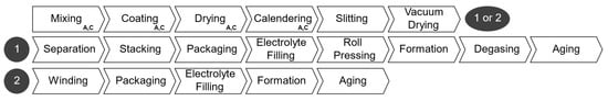 Electrode production (first line in Figure 4, and first section in Table 4) involves mixing active materials, carbon black, solvent, binder, and additives in proportions determined by the electrode configuration. The resulting slurry is coated onto copper (anode) and aluminum (cathode) foils using slot dies or doctor blades. Coating parameters like thickness, speed, and width are crucial for economic efficiency. The solvent in the slurry must be removed by letting the electrodes dry, often using a float dryer [19]. The subsequent calendering compresses the coated foil to adjust porosity and enhance adhesion. This process is very efficient in terms of costs and has little potential for improvement since it is already mature [20]. At this point, the electrodes are slit into smaller coils, and undergo vacuum drying to remove residual moisture and solvent in an oven for 12 h to 30 h at low temperatures of 60 °C to 150 °C [21].