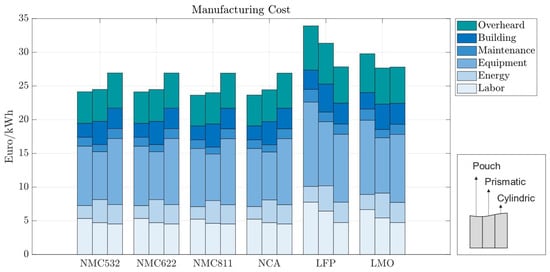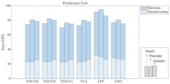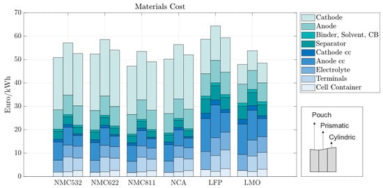 In all the battery cells, regardless of chemistry or format, the total cost is dominated by material costs, ranging from 62% to 70% of the production costs per kWh (Figure 6). Material costs are expected to vary between 65 and 80%, representing the major share of battery production costs [30,31]. For batteries using LFP, the material costs are the highest, varying between EUR 58.72 and EUR 64.4/kWh, depending on the cell format; while the LFP cathode material is cheaper, its lower energy density results in larger cells, consuming more of all other materials; the same happens for LMO cathodes. When more energy dense cathodes are used, such as NMC, the cost of cathode materials accounts for as much as 40% of the total material costs due to the high value of lithium, nickel, manganese, and cobalt, despite the lower amounts of active material used.