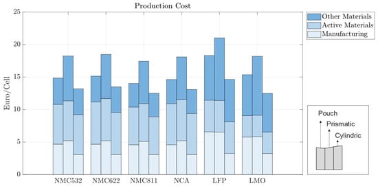 An EV battery system is responsible for about 25–35% of the total cost of a vehicle [5,6], making it the most prominent individual cost driver of EVs, and making it a component that would benefit from cost improvements; while many battery cell, module, and pack parameters have extensively been analyzed in their cost impact, the literature lacks comparisons and evaluations of different cell geometries and how they influence the final cost of a battery cell. The most complete battery cost and design model, the “Battery Performance and Cost” (BatPac) model of the Argonne National Laboratory [7], allows the user to describe battery packs in detail and to estimate thier production cost per kWh. Their model serves as the backbone of several different studies [8,9,10,11]. However, BatPac performs calculations assuming the battery cells have a stiff pouch construction; consequently, the studies based on it share this same limitation.