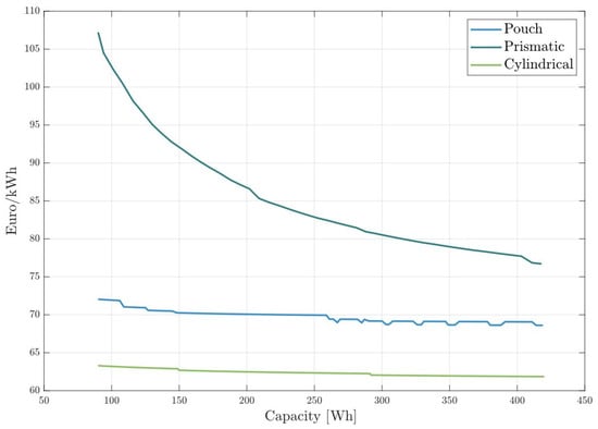 Our selection adopts the widely recognized 18650 cells as the foundational benchmark for the cost assessment of cylindrical cells. Pouch and prismatic cells are less standardized, but their dimensions were selected similarly to cylindrical cells. We based our selection on Link et al. [2], which identified trends in cell dimensions. The cell capacities were also determined from known market values.
