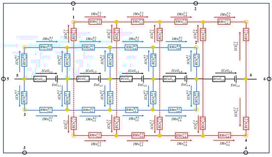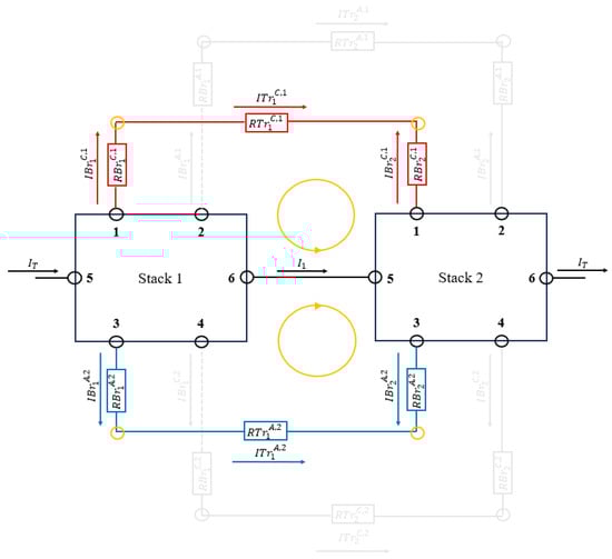 The goal of the model is to solve the equivalent electrical circuit by obtaining the currents through each element of the circuit. The number of currents to be determined in an equivalent circuit with stacks with cells in each is obtained with the expression in Equation (22).