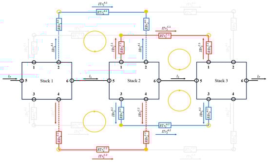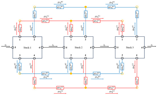 This circuit has been extended in the same way as seen in [15] to obtain an equivalent electrical circuit that models the shunt currents of a battery composed of several stacks of cells (Figure 3).